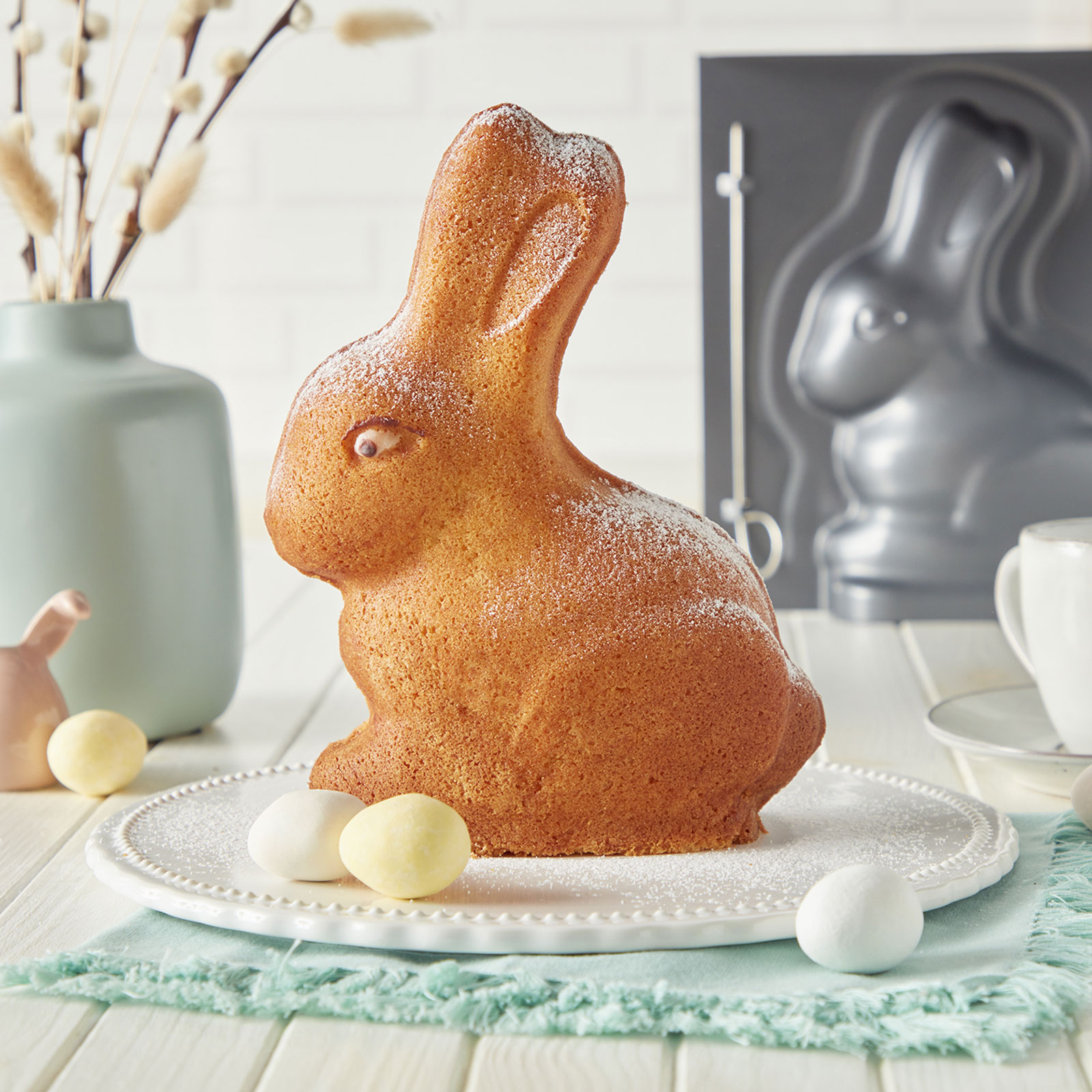 Sie suchen noch nach dem gewissen Etwas für Ihren Osterbrunch? Wie wäre es dann mit einem Hasenkuchen, gebacken in der 3D Backform Hase 24cm mit Antihaftbeschichtung von RBV Birkmann! Diese Vollbackform hilft Ihnen, einen Kuchen zu backen, der rundum die Form eines Osterhasen annimmt. 3D eben! Er kann auf Ihrem Buffet thronen oder auch als Teil Ihres Center Pieces Ihren Tisch schmücken. Und dann wird er auch noch gut schmecken, wenn es Zeit ist, ihn anzuschneiden. Diese Form hat eine Füllmenge von 1 Liter.