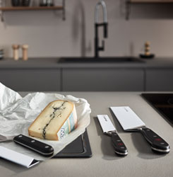 Käse zu schneiden kann schwierig werden, weil er an der Klinge eines normalen Messers kleben bleibt. Dafür gibt es extra Käsemesser! Zum Beispiel Weichkäsemesser mit Aussparungen in der Klinge, die ebendieses Festkleben verhindern. Oder auch Messer mit schmalen Klingen, an denen nicht viel kleben bleiben kann. Alle vereint sie eins: Eine Spitze, auf der Sie kleinere Stücke Käse aufspießen können.