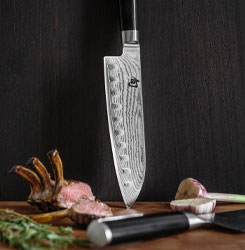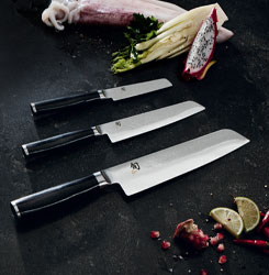 Das Santokumesser ist in Japan als das Messer der „drei Tugenden“ bekannt. Die Tugenden: Gemüse, Fleisch und Fisch. Es ist also die Messerform, die in der japanischen Küche als Allzweckmesser verwendet wird. Und das aus gutem Grund, denn die Klingenform ist sowohl geeignet für den Wiegeschnitt als auch für den Druckschnitt. Das macht Santokumesser sehr vielfältig. Eine zusätzliche Veredelung mit einem sogenannten Kullenschliff in der Klinge kann dafür sorgen, dass das Schneidgut nicht am Klingenblatt kleben bleibt.