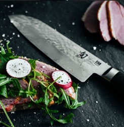 „Santoku“ bedeutet auf Japanisch so viel wie „drei Tugenden.“ Diese Tugenden sind: Gemüse, Fisch und Fleisch! Für Santokumesser ist weniger bedeutend, was sie schneiden. Viel wichtiger sind das Wie und das Warum.